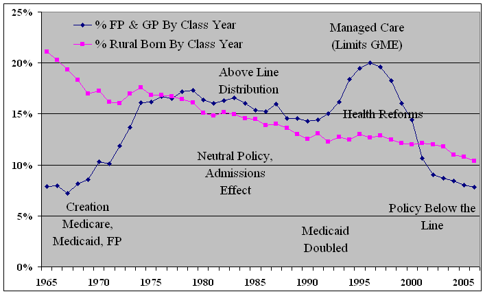 Note that the rural born "line" is a proxy for distributional student admissions which include all who have origins outside of major medical centers: rural born, lower income, older, children not of professionals, middle income. This is a group of about 30% of admitted medical students but represents 70% of the population. Those with origins outside have the most potential for outside location, most fully expressed by choice of family medicine and during times when the nation maximizes health policy for distribution.