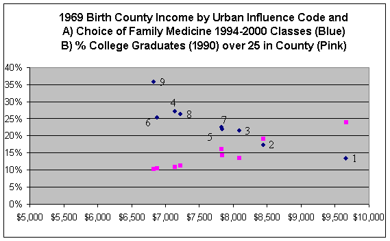 As county income and college graduation levels in a county increase, the percentage choosing family medicine from students born in such counties decreases.